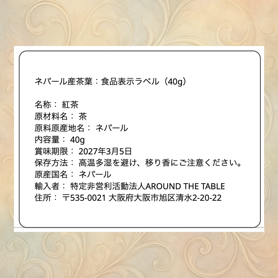 ネパール産茶葉:食品表示ラベル(40g)